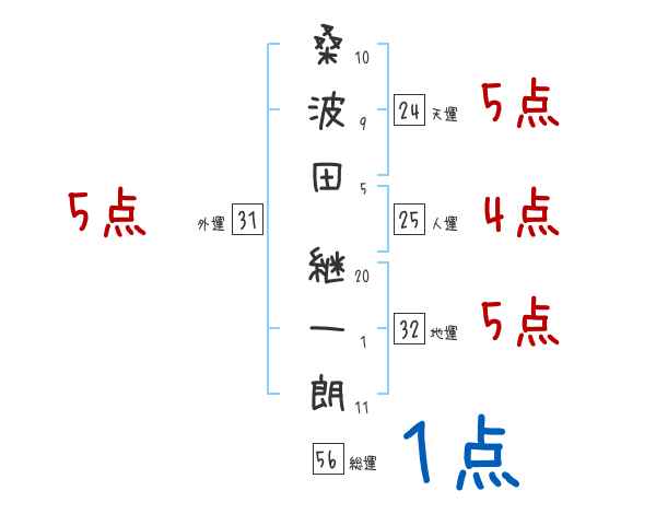 天運![]() | 桑波田継一朗さんの天運は24画の5つ星!家庭運が良く順調な人生。金運にも恵まれる。 家系が持つ宿命的な運勢を表します。祖先から受け継いだ苗字ですので自分の力が及びません。家柄を象徴します。 |
