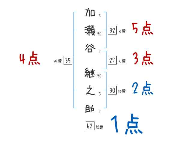 外運![]() | 加瀬谷継之助さんの外運は35画の4つ星!温厚な性格で感受性が高い。穏和な性格で人望が厚い。 生活面を象徴する運勢です。外部から受ける影響力を表し、結婚運、家庭運や職場、環境への順応性を表します。 |