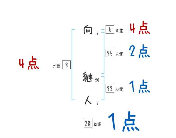 天運![]() | 向継人さんの天運は6画の4つ星!慎重な努力家で信頼を得る。誠実な精神で向上心に優れる。 家系が持つ宿命的な運勢を表します。祖先から受け継いだ苗字ですので自分の力が及びません。家柄を象徴します。 |