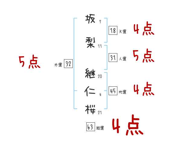 外運![]() | 坂梨継仁桜さんの外運は32画の5つ星!柔軟性があり成功する。チャンスが多く金運が良い。 生活面を象徴する運勢です。外部から受ける影響力を表し、結婚運、家庭運や職場、環境への順応性を表します。 |