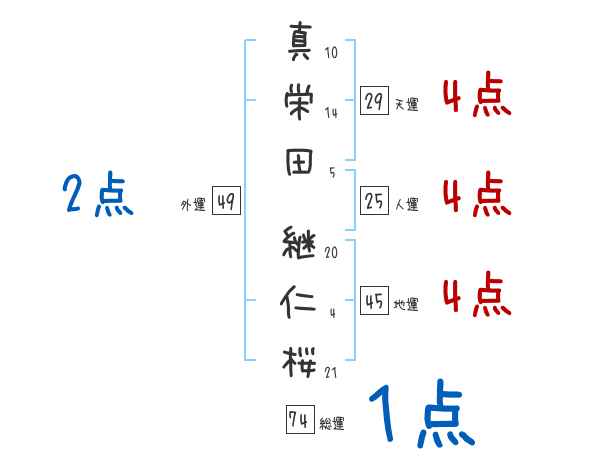 天運![]() | 真栄田継仁桜さんの天運は29画の4つ星!完全主義で才能がある。厳格な心の持ち主。 家系が持つ宿命的な運勢を表します。祖先から受け継いだ苗字ですので自分の力が及びません。家柄を象徴します。 |