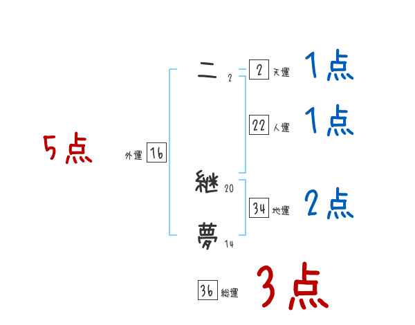天運![]() | 二継夢さんの天運は2画の1つ星!優しいですが積極性や意思の強さに欠ける傾向があります。家庭環境の乱れに注意しましょう。 家系が持つ宿命的な運勢を表します。祖先から受け継いだ苗字ですので自分の力が及びません。家柄を象徴します。 |