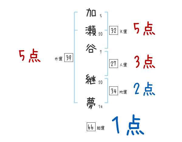 天運![]() | 加瀬谷継夢さんの天運は32画の5つ星!柔軟性があり成功する。チャンスが多く金運が良い。 家系が持つ宿命的な運勢を表します。祖先から受け継いだ苗字ですので自分の力が及びません。家柄を象徴します。 |
