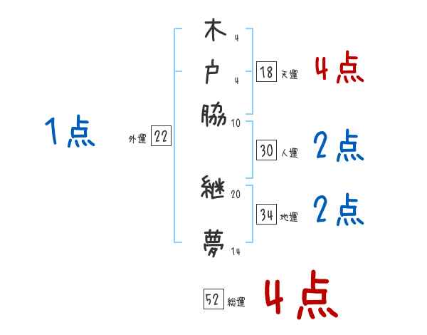 天運![]() | 木戸脇継夢さんの天運は18画の4つ星!情熱的で剛気。忍耐力があり信頼される。 家系が持つ宿命的な運勢を表します。祖先から受け継いだ苗字ですので自分の力が及びません。家柄を象徴します。 |
