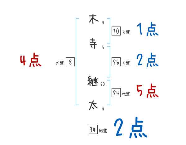 総運![]() | 木寺継太さんの総運は34画の2つ星!独創性に優れるが、自尊心が強く災難に注意しましょう。 あなたの人生を表す1番重要な運勢です。生涯を通じて影響する総合運となり、主に50歳以降の晩年期に影響を及ぼします。 |