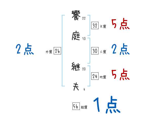 天運![]() | 饗庭継夫さんの天運は32画の5つ星!柔軟性があり成功する。チャンスが多く金運が良い。 家系が持つ宿命的な運勢を表します。祖先から受け継いだ苗字ですので自分の力が及びません。家柄を象徴します。 |