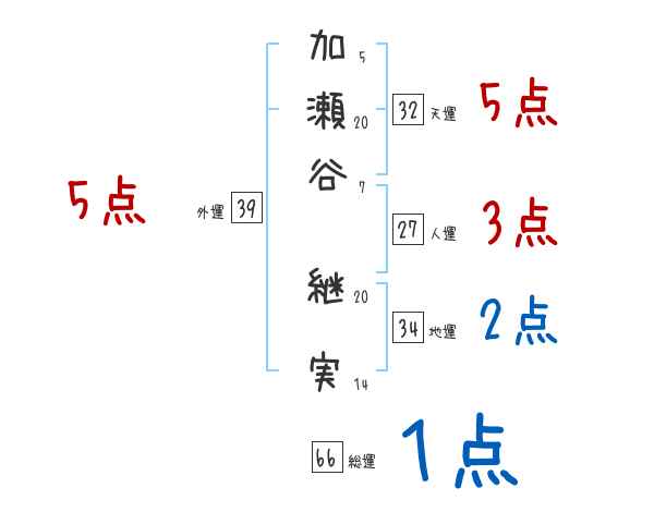 天運![]() | 加瀬谷継実さんの天運は32画の5つ星!柔軟性があり成功する。チャンスが多く金運が良い。 家系が持つ宿命的な運勢を表します。祖先から受け継いだ苗字ですので自分の力が及びません。家柄を象徴します。 |
