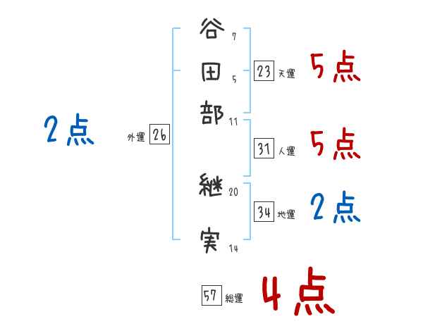 総運![]() | 谷田部継実さんの総運は57画の4つ星!向上心があり人望がある。地位を得る。 あなたの人生を表す1番重要な運勢です。生涯を通じて影響する総合運となり、主に50歳以降の晩年期に影響を及ぼします。 |