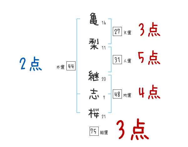 外運![]() | 亀梨継志桜さんの外運は44画の2つ星!誠実で慎重な性格。物事を考えすぎないように注意しましょう。 生活面を象徴する運勢です。外部から受ける影響力を表し、結婚運、家庭運や職場、環境への順応性を表します。 |