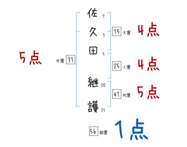 外運![]() | 佐久田継護さんの外運は31画の5つ星!社交性があり判断力に優れる。順風満帆な人生で円満な生活。 生活面を象徴する運勢です。外部から受ける影響力を表し、結婚運、家庭運や職場、環境への順応性を表します。 |