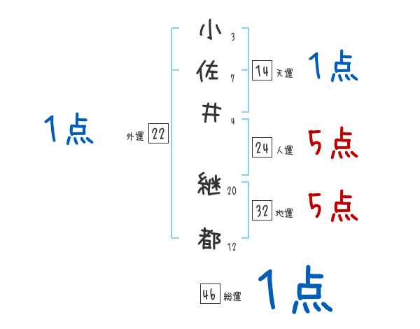 地運![]() | 小佐井継都さんの地運は32画の5つ星!柔軟性があり成功する。チャンスが多く金運が良い。 個性を表す基礎的な運勢です。性格形成や対人関係、行動力など家庭環境に影響されます。主に誕生してから20歳くらいまでの若年期の運勢を表します。 |