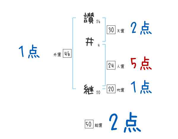 天運![]() | 讃井継さんの天運は30画の2つ星!浮き沈みの激しさに注意しましょう。 家系が持つ宿命的な運勢を表します。祖先から受け継いだ苗字ですので自分の力が及びません。家柄を象徴します。 |