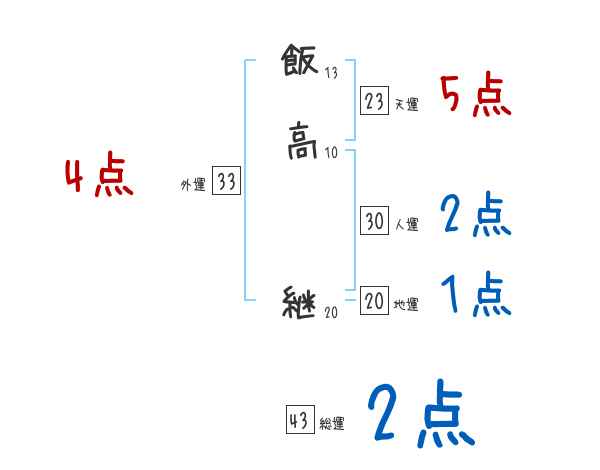 天運![]() | 飯高継さんの天運は23画の5つ星!想像力に優れ活力がある。一代で成功し名誉を手に入れる。 家系が持つ宿命的な運勢を表します。祖先から受け継いだ苗字ですので自分の力が及びません。家柄を象徴します。 |