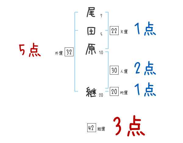 外運![]() | 尾田原継さんの外運は32画の5つ星!柔軟性があり成功する。チャンスが多く金運が良い。 生活面を象徴する運勢です。外部から受ける影響力を表し、結婚運、家庭運や職場、環境への順応性を表します。 |