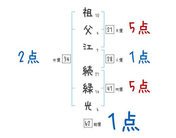 天運![]() | 祖父江続緑光さんの天運は21画の5つ星!統率力がある。独立し成功する。名誉を手に入れる。 家系が持つ宿命的な運勢を表します。祖先から受け継いだ苗字ですので自分の力が及びません。家柄を象徴します。 |