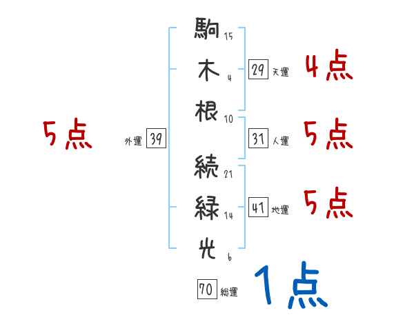 外運![]() | 駒木根続緑光さんの外運は39画の5つ星!社交性に優れ人望が厚い。人の上に立ち成功する。 生活面を象徴する運勢です。外部から受ける影響力を表し、結婚運、家庭運や職場、環境への順応性を表します。 |