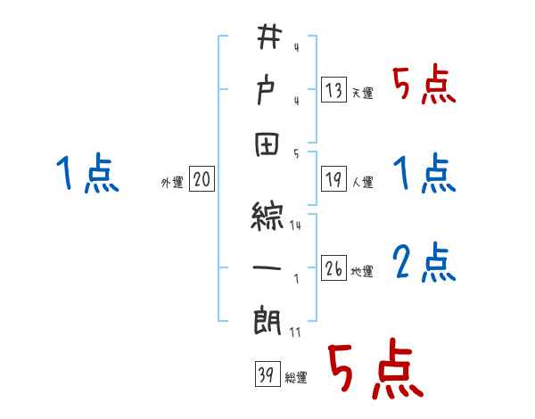 天運![]() | 井戸田綜一朗さんの天運は13画の5つ星!才能に恵まれ人気がある。名声を手に入れる。円満な人生。 家系が持つ宿命的な運勢を表します。祖先から受け継いだ苗字ですので自分の力が及びません。家柄を象徴します。 |