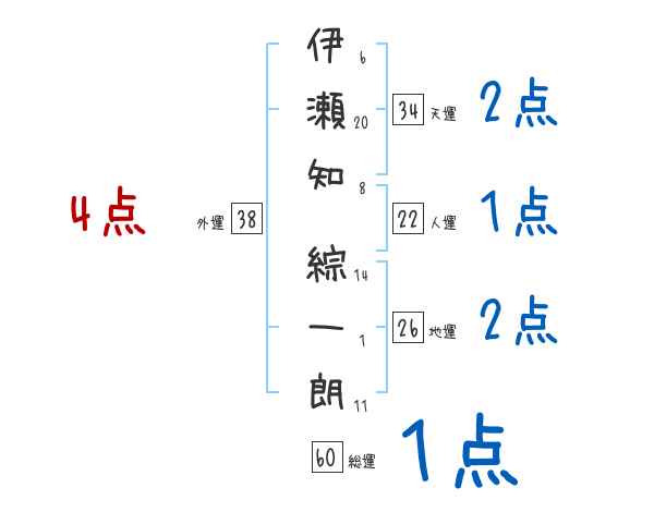 外運![]() | 伊瀬知綜一朗さんの外運は38画の4つ星!温厚な性格で技術的な才能を発揮する。職人的な仕事に向いている。 生活面を象徴する運勢です。外部から受ける影響力を表し、結婚運、家庭運や職場、環境への順応性を表します。 |