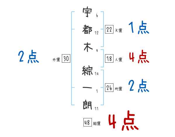 天運![]() | 宇都木綜一朗さんの天運は22画の1つ星!努力することが苦手ないっぽう手先が器用。芸術性にも優れる。 家系が持つ宿命的な運勢を表します。祖先から受け継いだ苗字ですので自分の力が及びません。家柄を象徴します。 |