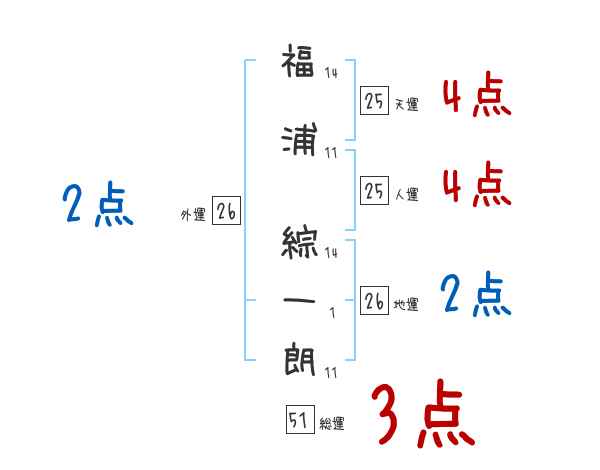 天運![]() | 福浦綜一朗さんの天運は25画の4つ星!個性があり才能があふれる。強運の持ち主で発展する。 家系が持つ宿命的な運勢を表します。祖先から受け継いだ苗字ですので自分の力が及びません。家柄を象徴します。 |