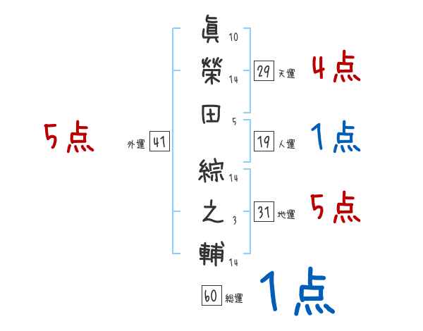 天運![]() | 眞榮田綜之輔さんの天運は29画の4つ星!完全主義で才能がある。厳格な心の持ち主。 家系が持つ宿命的な運勢を表します。祖先から受け継いだ苗字ですので自分の力が及びません。家柄を象徴します。 |