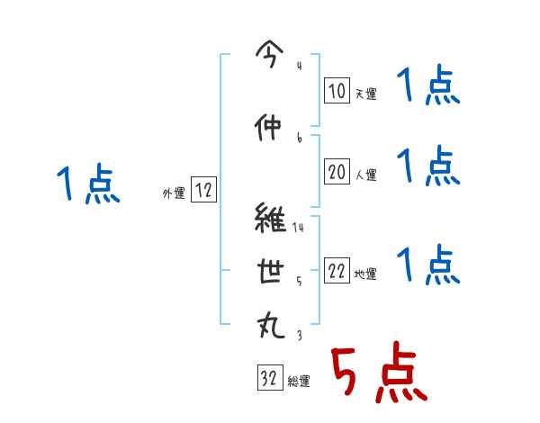 天運![]() | 今仲維世丸さんの天運は10画の1つ星!不安を感じやすい傾向。ストレスを抱えないように注意しましょう。 家系が持つ宿命的な運勢を表します。祖先から受け継いだ苗字ですので自分の力が及びません。家柄を象徴します。 |