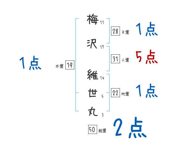 天運![]() | 梅沢維世丸さんの天運は28画の1つ星!家庭環境に注意。スポーツで活躍できる能力があるかも。 家系が持つ宿命的な運勢を表します。祖先から受け継いだ苗字ですので自分の力が及びません。家柄を象徴します。 |
