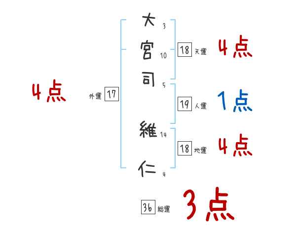 天運![]() | 大宮司維仁さんの天運は18画の4つ星!情熱的で剛気。忍耐力があり信頼される。 家系が持つ宿命的な運勢を表します。祖先から受け継いだ苗字ですので自分の力が及びません。家柄を象徴します。 |