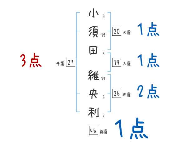 外運![]() | 小須田維央利さんの外運は27画の3つ星!頭脳明晰だが強情で摩擦が多い傾向。孤立に注意。 生活面を象徴する運勢です。外部から受ける影響力を表し、結婚運、家庭運や職場、環境への順応性を表します。 |