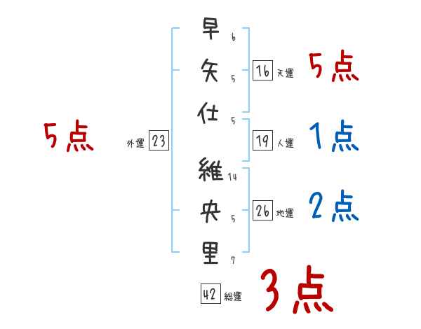 天運![]() | 早矢仕維央里さんの天運は16画の5つ星!人望が厚く大きく発展する。逆転成功が見える。 家系が持つ宿命的な運勢を表します。祖先から受け継いだ苗字ですので自分の力が及びません。家柄を象徴します。 |