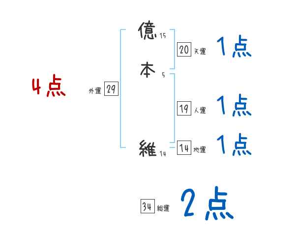 総運![]() | 億本維さんの総運は34画の2つ星!独創性に優れるが、自尊心が強く災難に注意しましょう。 あなたの人生を表す1番重要な運勢です。生涯を通じて影響する総合運となり、主に50歳以降の晩年期に影響を及ぼします。 |