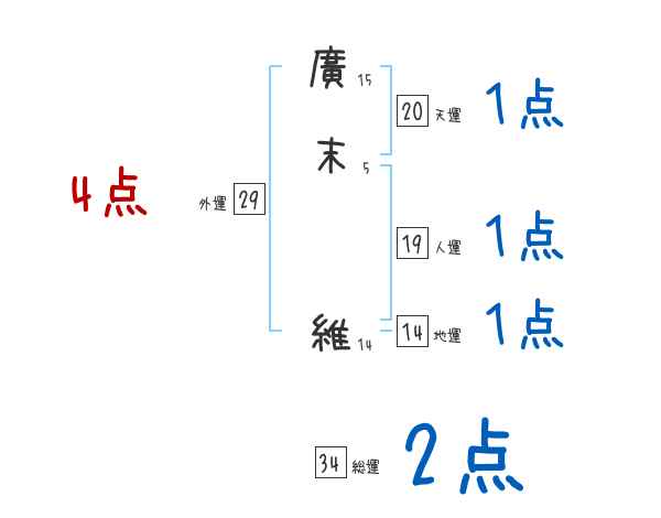 外運![]() | 廣末維さんの外運は29画の4つ星!完全主義で才能がある。厳格な心の持ち主。 生活面を象徴する運勢です。外部から受ける影響力を表し、結婚運、家庭運や職場、環境への順応性を表します。 |