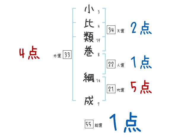 外運![]() | 小比類巻綱成さんの外運は33画の4つ星!権力志向でプライドが高い。勇気があり運を切り開き成功する。 生活面を象徴する運勢です。外部から受ける影響力を表し、結婚運、家庭運や職場、環境への順応性を表します。 |