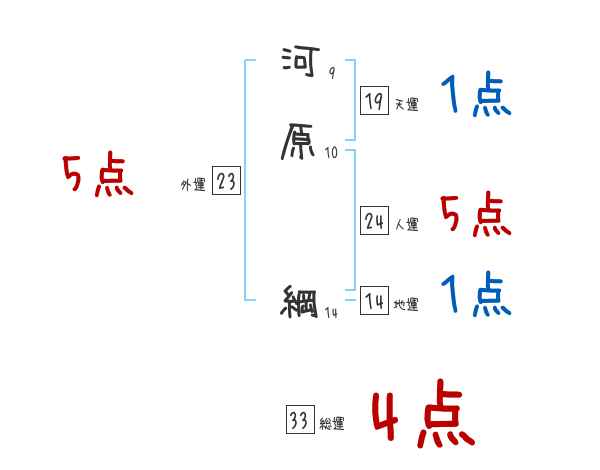 天運![]() | 河原綱さんの天運は19画の1つ星!優れた才能を持ちますが、協調性が足りないことも。周りの人と協力する事を意識しましょう。 家系が持つ宿命的な運勢を表します。祖先から受け継いだ苗字ですので自分の力が及びません。家柄を象徴します。 |