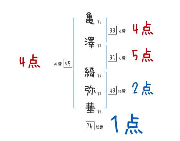 天運![]() | 亀澤綺弥華さんの天運は33画の4つ星!権力志向でプライドが高い。勇気があり運を切り開き成功する。 家系が持つ宿命的な運勢を表します。祖先から受け継いだ苗字ですので自分の力が及びません。家柄を象徴します。 |