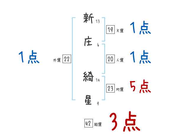 天運![]() | 新庄綺星さんの天運は19画の1つ星!優れた才能を持ちますが、協調性が足りないことも。周りの人と協力する事を意識しましょう。 家系が持つ宿命的な運勢を表します。祖先から受け継いだ苗字ですので自分の力が及びません。家柄を象徴します。 |