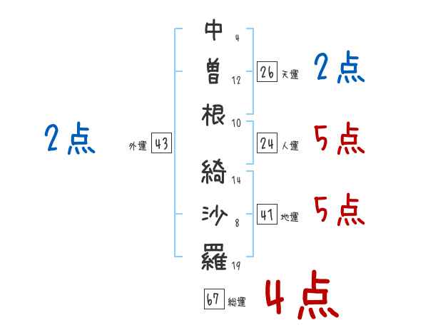 人運![]() | 中曽根綺沙羅さんの人運は24画の5つ星!家庭運が良く順調な人生。金運にも恵まれる。 性格や才能などを表す2番目に重要な運勢です。人間関係や協調性、社会的な成功に影響します。主に20歳から50歳ぐらいまでの中年期の運勢を表します。 |