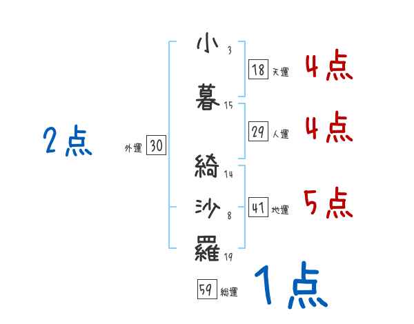 天運![]() | 小暮綺沙羅さんの天運は18画の4つ星!情熱的で剛気。忍耐力があり信頼される。 家系が持つ宿命的な運勢を表します。祖先から受け継いだ苗字ですので自分の力が及びません。家柄を象徴します。 |