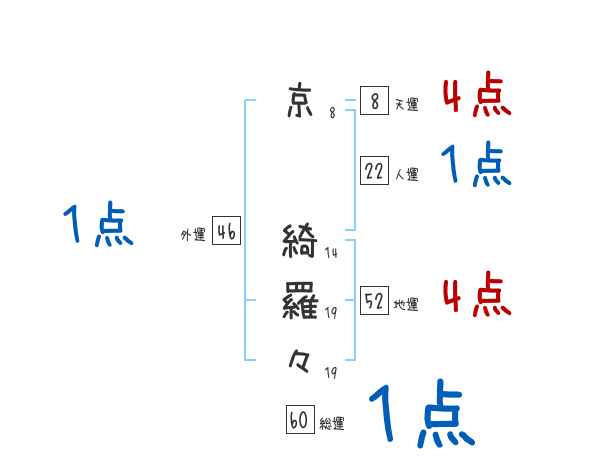 天運![]() | 京綺羅々さんの天運は8画の4つ星!勤勉家。根気強く努力し成功する。忍耐力がある。 家系が持つ宿命的な運勢を表します。祖先から受け継いだ苗字ですので自分の力が及びません。家柄を象徴します。 |