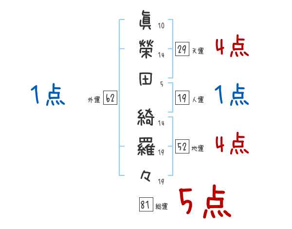 総運![]() | 眞榮田綺羅々さんの総運は81画の5つ星!行動力、指導力があり出世し繁栄する。幸運に恵まれる。 あなたの人生を表す1番重要な運勢です。生涯を通じて影響する総合運となり、主に50歳以降の晩年期に影響を及ぼします。 |