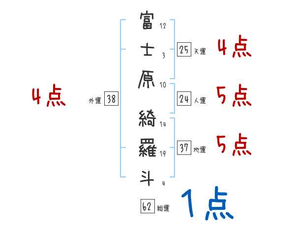 天運![]() | 富士原綺羅斗さんの天運は25画の4つ星!個性があり才能があふれる。強運の持ち主で発展する。 家系が持つ宿命的な運勢を表します。祖先から受け継いだ苗字ですので自分の力が及びません。家柄を象徴します。 |