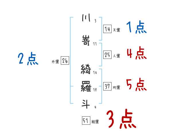外運![]() | 川嵜綺羅斗さんの外運は26画の2つ星!波瀾万丈かも。信頼できる人を大事にしましょう。 生活面を象徴する運勢です。外部から受ける影響力を表し、結婚運、家庭運や職場、環境への順応性を表します。 |