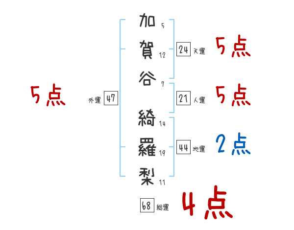 外運![]() | 加賀谷綺羅梨さんの外運は47画の5つ星!実力が開花し発展する円満な人生。財に恵まれる。 生活面を象徴する運勢です。外部から受ける影響力を表し、結婚運、家庭運や職場、環境への順応性を表します。 |
