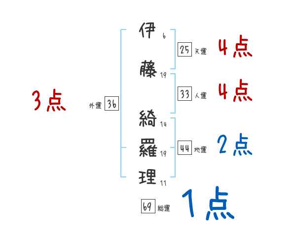 外運![]() | 伊藤綺羅理さんの外運は36画の3つ星!先見性が豊かです。多少神経質で苦労することも。 生活面を象徴する運勢です。外部から受ける影響力を表し、結婚運、家庭運や職場、環境への順応性を表します。 |