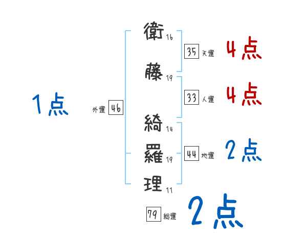 地運![]() | 衛藤綺羅理さんの地運は44画の2つ星!誠実で慎重な性格。物事を考えすぎないように注意しましょう。 個性を表す基礎的な運勢です。性格形成や対人関係、行動力など家庭環境に影響されます。主に誕生してから20歳くらいまでの若年期の運勢を表します。 |