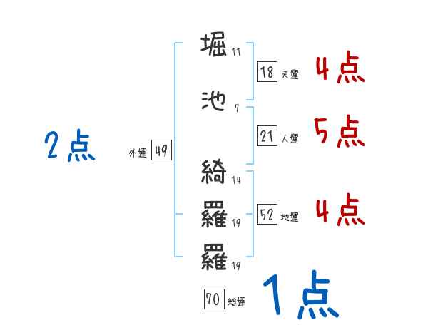 天運![]() | 堀池綺羅羅さんの天運は18画の4つ星!情熱的で剛気。忍耐力があり信頼される。 家系が持つ宿命的な運勢を表します。祖先から受け継いだ苗字ですので自分の力が及びません。家柄を象徴します。 |