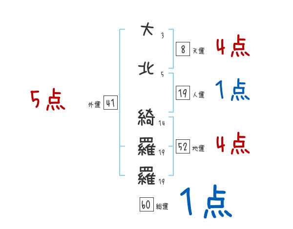 天運![]() | 大北綺羅羅さんの天運は8画の4つ星!勤勉家。根気強く努力し成功する。忍耐力がある。 家系が持つ宿命的な運勢を表します。祖先から受け継いだ苗字ですので自分の力が及びません。家柄を象徴します。 |