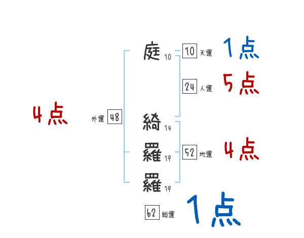 地運![]() | 庭綺羅羅さんの地運は52画の4つ星!先見性と独創性に優れ考える力がある。強運の持ち主。 個性を表す基礎的な運勢です。性格形成や対人関係、行動力など家庭環境に影響されます。主に誕生してから20歳くらいまでの若年期の運勢を表します。 |