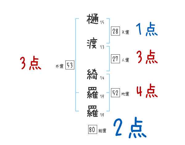 外運![]() | 樋渡綺羅羅さんの外運は53画の3つ星!やや見栄っ張りで虚栄心がある。散財に注意。 生活面を象徴する運勢です。外部から受ける影響力を表し、結婚運、家庭運や職場、環境への順応性を表します。 |