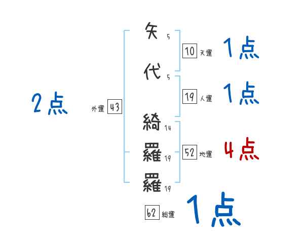 天運![]() | 矢代綺羅羅さんの天運は10画の1つ星!不安を感じやすい傾向。ストレスを抱えないように注意しましょう。 家系が持つ宿命的な運勢を表します。祖先から受け継いだ苗字ですので自分の力が及びません。家柄を象徴します。 |